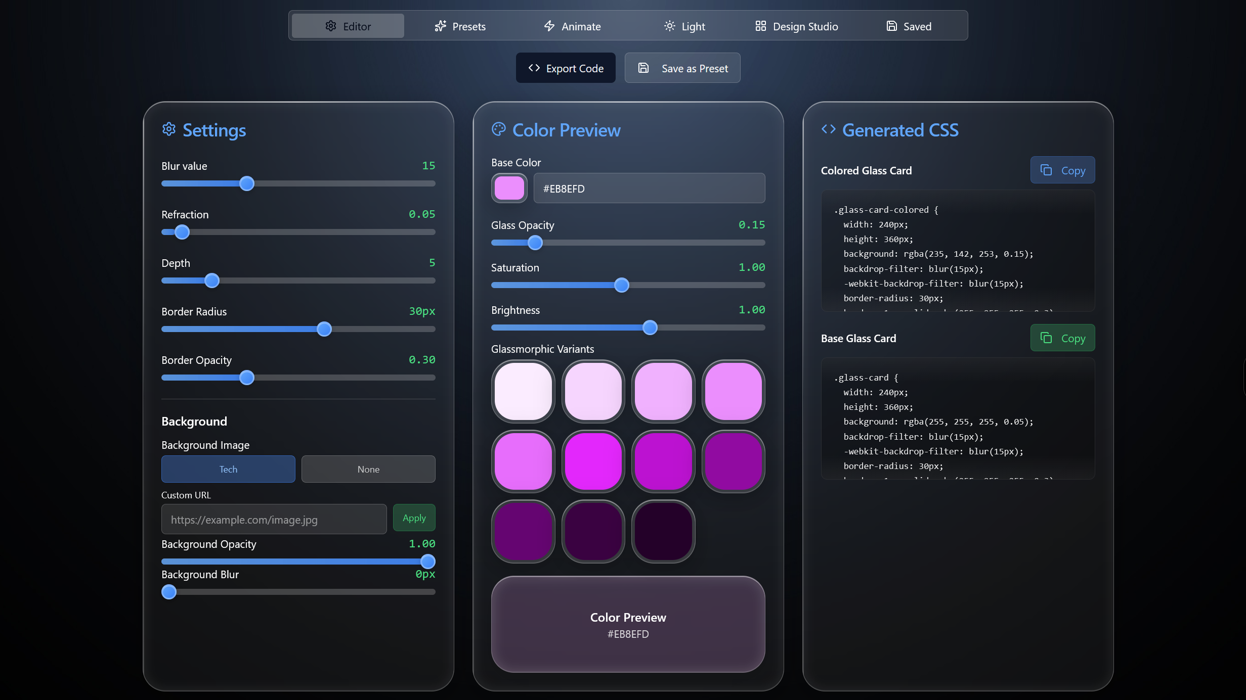 Interactive design tool for creating beautiful glassmorphism UI effects with live CSS generation